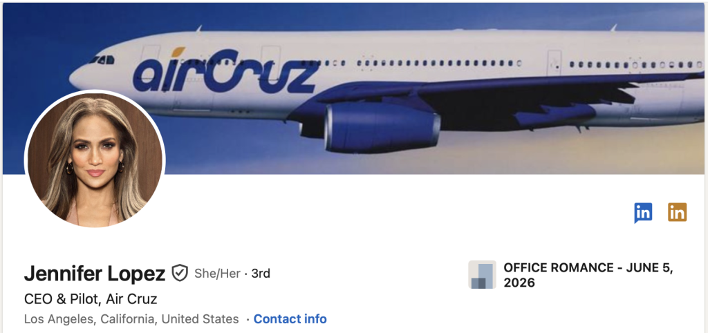 - JLo announced her new movie with a LinkedIn profile update. Puts in her old movie roles as jobs too ha.