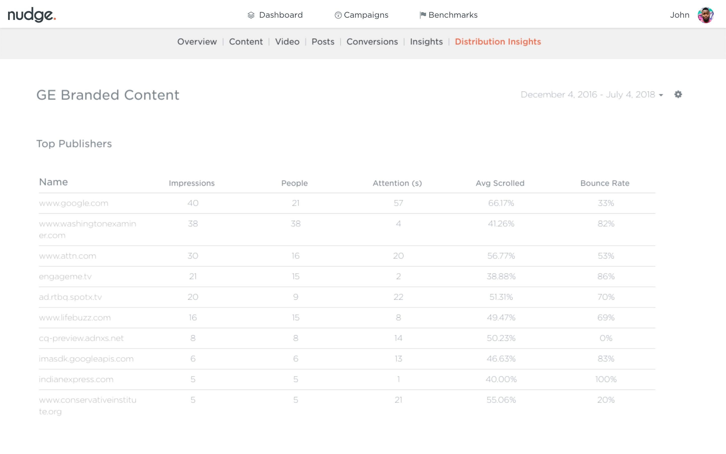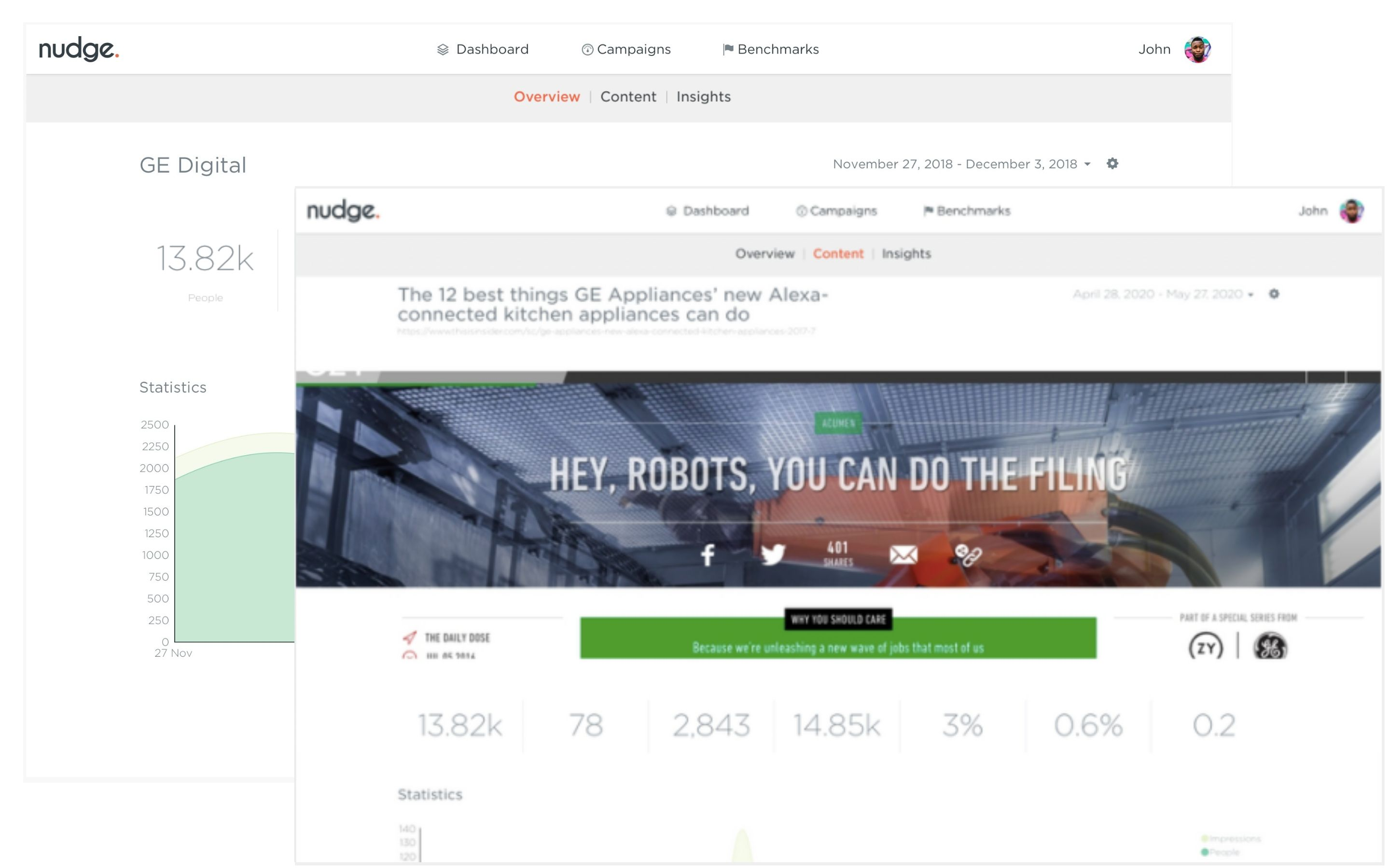 Nudge provides marketers with a holistic view of their content in one dashboard. The dashboard provides proprietary content-first metrics as well as data from your social. This feedback loop ensures your team knows where they are and what to do to achieve goals.