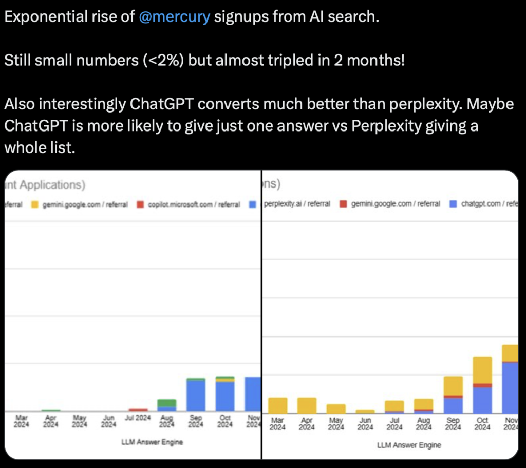 Mercury bank, and Vercel app platform both experienced approximately a threefold increase in their signups, driven from the LLMs. Notably ChatGPT as the biggest source.